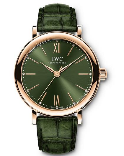 The IWC Portofino(Replica IWC Portofino) series is one of IWC’s best-selling series. The pocket watch-style design style and the simple and open dial are the design highlights of this series. The Portofino series has watch styles of different sizes, this IWC Portofino Automatic Diamond Green Dial Ladies Watch IW357409, the watch diameter of 34 mm, is the smaller model in the series, which is very suitable for slender wrists. The watch features an 18K red gold case with a green dial, willow-shaped hands, Roman numerals and linear hour markers surrounded by 12 diamonds. The watch is equipped with a 35100 self-winding movement, equipped with a central second hand with an engine stop device (maintaining the accuracy of travel time), providing a 42-hour power reserve. The watch is equipped with a green alligator leather strap, which also has a quick-change system. The watch is water resistant to 30 meters.Replica IWC Watches