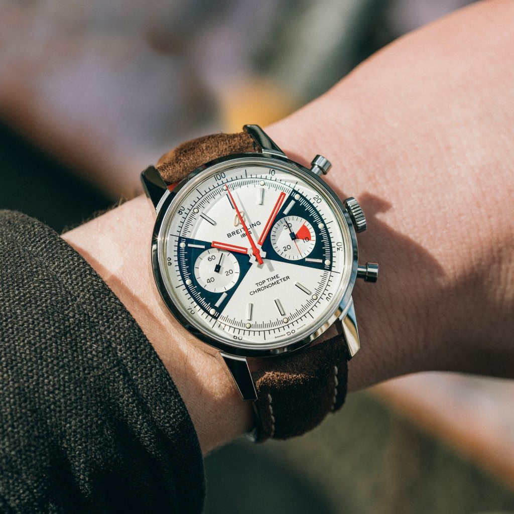 Breitling Top Time Deus 41 Stainless Steel White Watch A233112A1A1X1Replica Breitling Top Time). Although this watch also uses a contrasting color design, the overall design is more retro and fresh. The Top Time Deus chronograph is equipped with a 41mm stainless steel case and adopts a new color scheme than its predecessor: luminous hour markers and a white lacquered dial, which contrast sharply with the sky blue small dial and tachymeter ring. In addition, the dial still inherits the classic design elements of the previous model: lightning-shaped chronograph seconds hand, mushroom button, motorcycle rider pattern engraved on the bottom cover, and racing-style calfskin strap. The watch is equipped with Caliber 23 automatic movement, which has been precision certified by the Swiss Official Observatory Testing Agency (COSC). It has a timing accuracy of up to 1/4 second and can provide a 48-hour power reserve when fully wound.Breitling Watches Replica