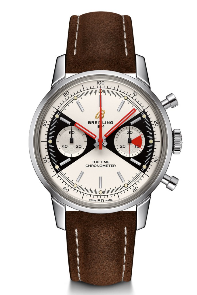 Breitling Top Time(Replica Breitling Top Time) series watches are unique, combining extraordinary design, legendary history and outstanding timekeeping performance. When Breitling launched the original Top Time series watches in the 1960s, the goal was very clear, that is, to meet the needs of “young and promising professionals” with a series of “ultra-modern chronographs”. The Top Time series watch uses a 41 mm stainless steel case with a brown nubuck leather strap with a stainless steel pin buckle. The watch is equipped with the Breitling B23 chronograph movement certified by the Swiss Official Astronomical Observatory (COSC).Replica Breitling Watches